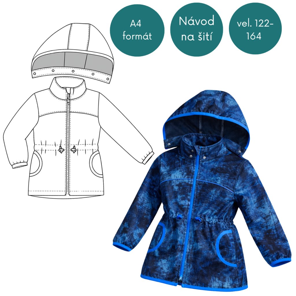 Tato dětská softshellová bunda je ideálním kouskem pro přechodná období i chladnější jarní a podzimní dny. Díky praktickému střihu s odepínací kapucí a stahováním v pase se přizpůsobí různým potřebám i počasí. Bunda je pohodlná, slušivá a navržená s ohledem na volnost pohybu – perfektní pro každodenní nošení do školy, na výlety i volnočasové aktivity. Střih je celý pečlivě rýsovaný ručně a poté převedený do PDF formátu – ruční tvorba mu však nijak neubírá na kvalitě ani přesnosti.