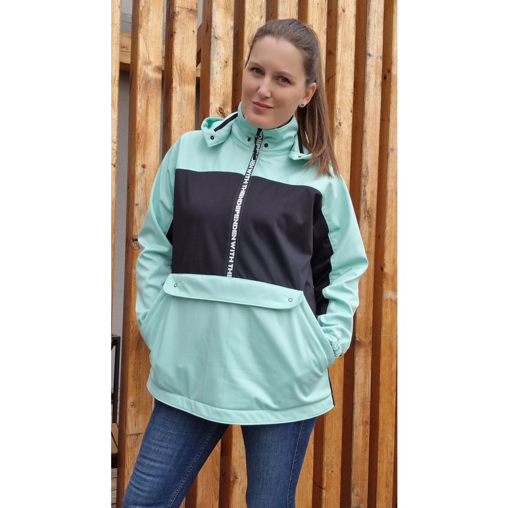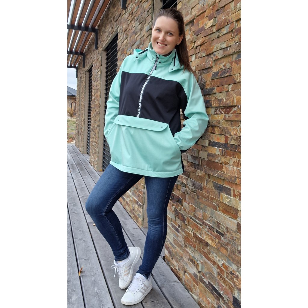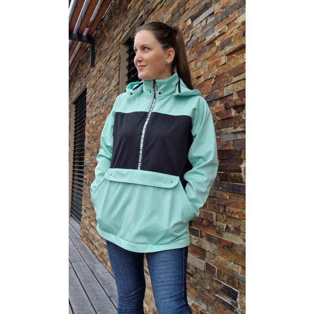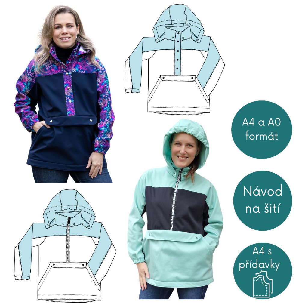 Střih na větrovku/ bundu volné siluety s oblékáním přes hlavu. Bunda obsahuje:
