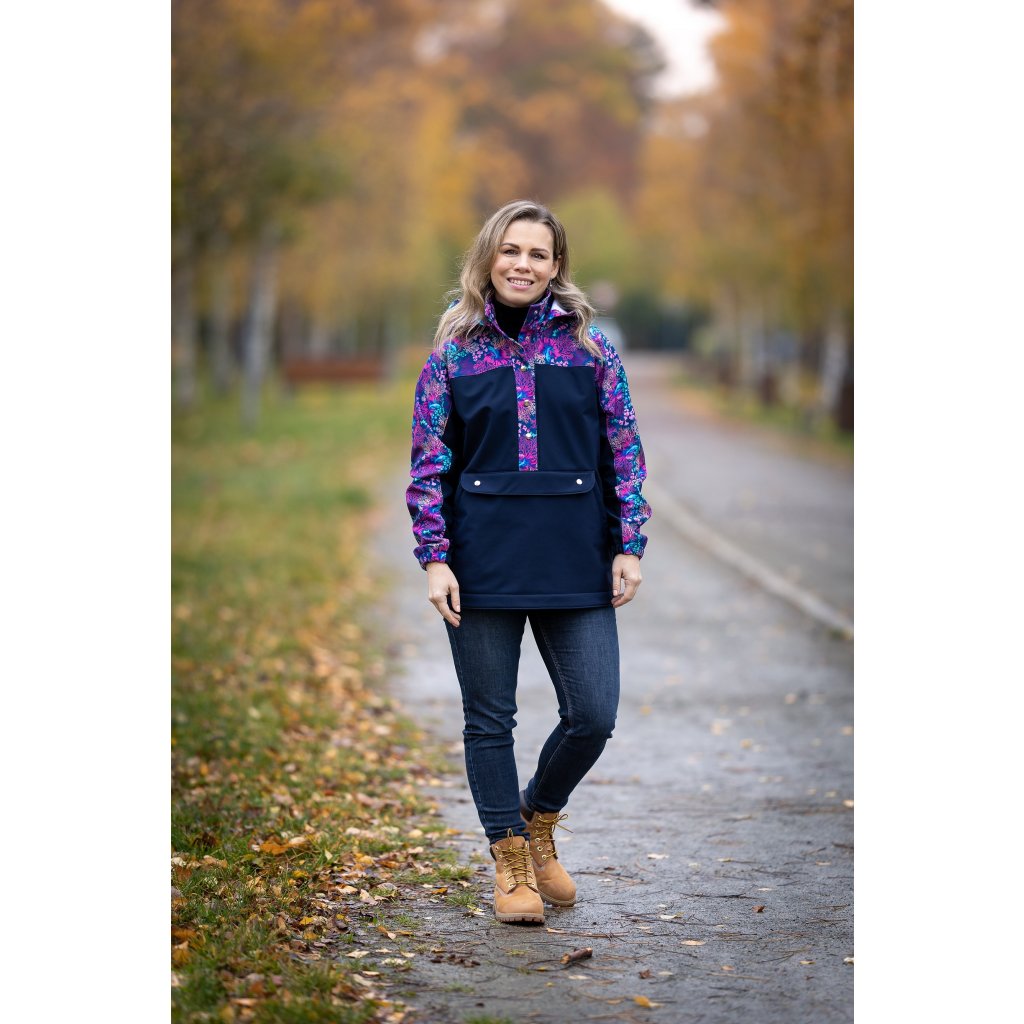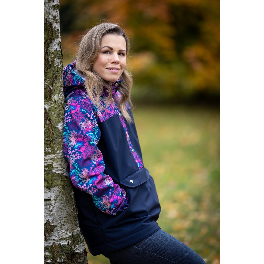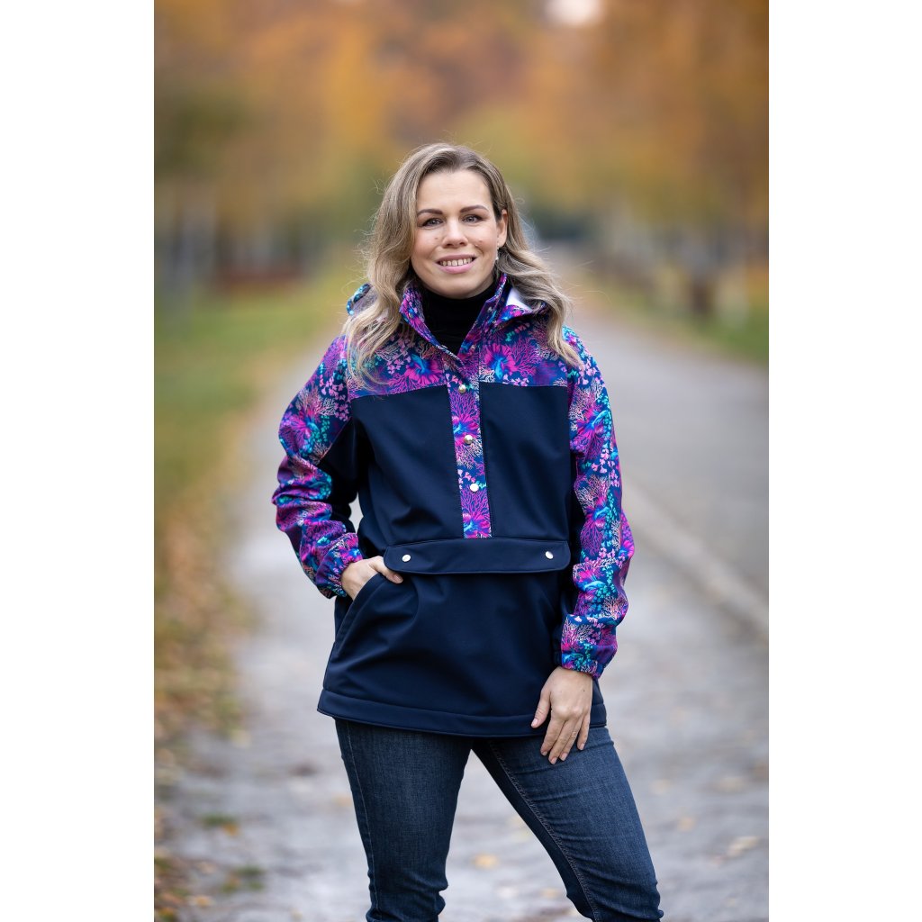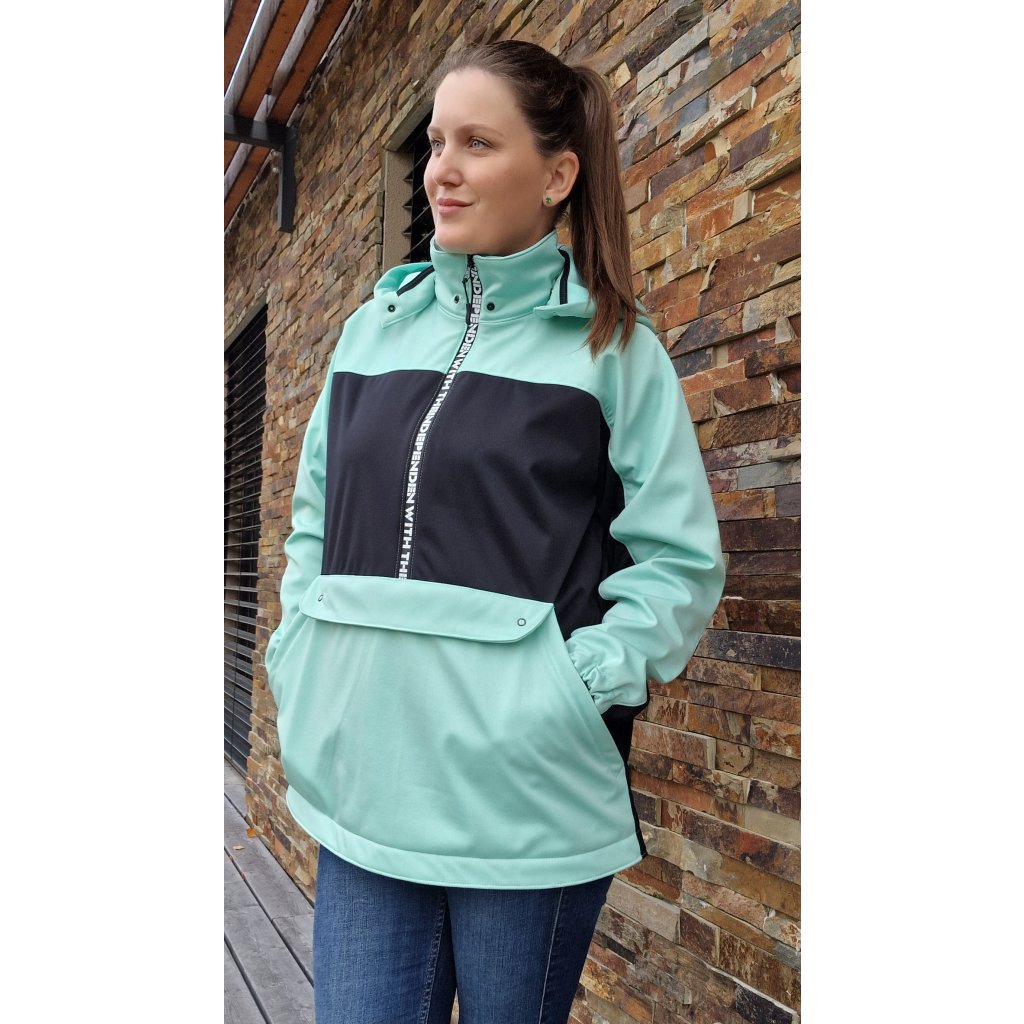 Střih na větrovku/ bundu volné siluety s oblékáním přes hlavu. Bunda obsahuje: