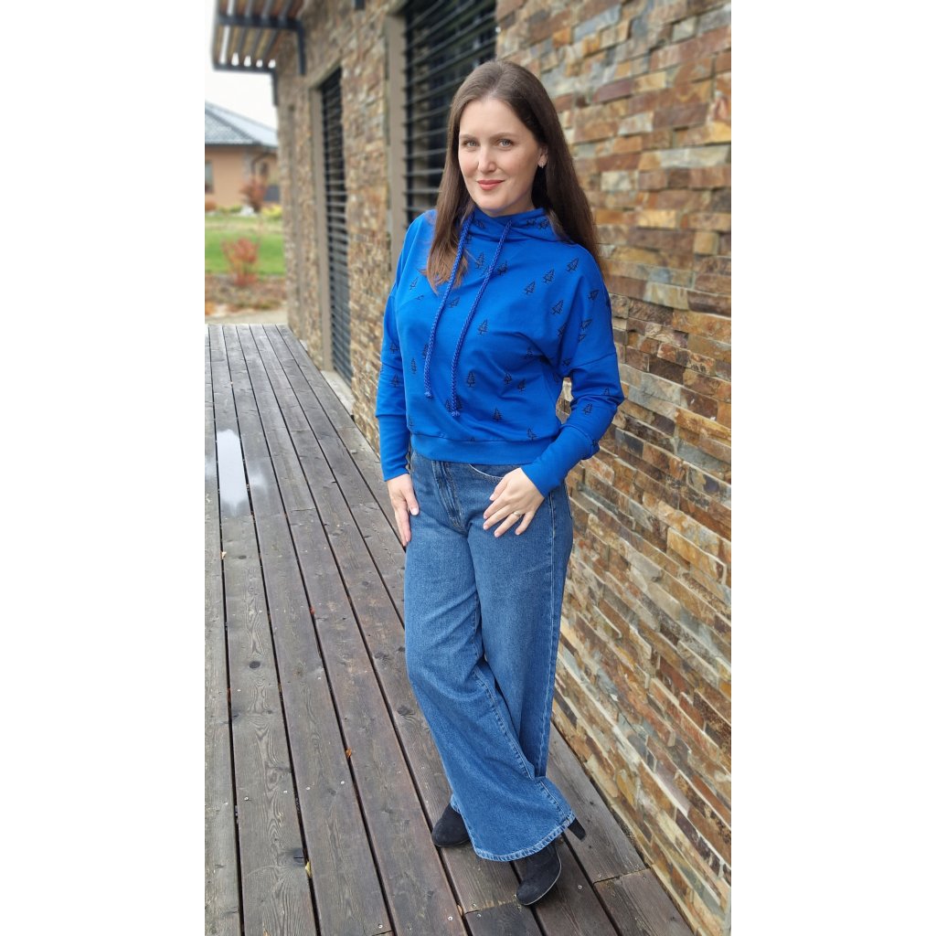 Představuji Vám elektronický střih na dámskou mikinu Adel – Mikinu módní krátké délky s asymetrickým řešením předního dílu, kapucí, spadlými rukávy s vysokými náplety.