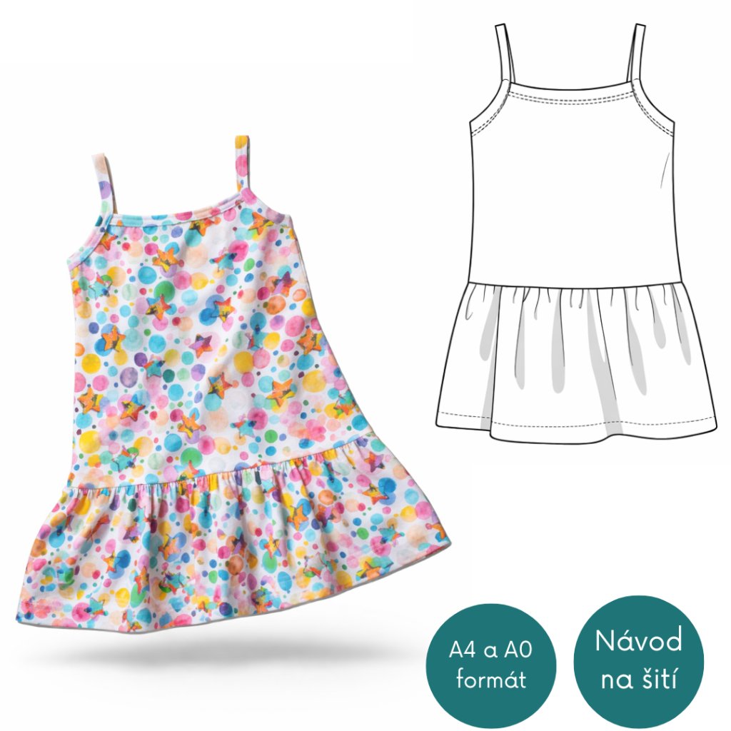 Střih na dívčí šaty na ramínka s volánem u dolního kraje. Střih je rýsovaný v profesionálním konstrukčním programu a převedený do PDF formátu. :-) Střih je třeba vytisknout a poslepovat! Střih je bez přídavků na švy a záložky. Nejedná se o papírový střih.