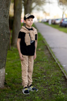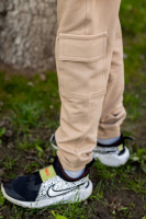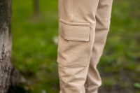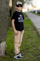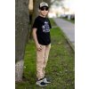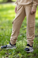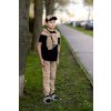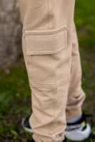 tištěný střih na dětské tepláky kapsáče. Střih má zúženou siluetu nohavic , které zdobí nakládané kapsy s patkami . Dále střih obsahuje klínové kapsy a falešný poklopec, který dává teplákům vzhled klasických kalhot.