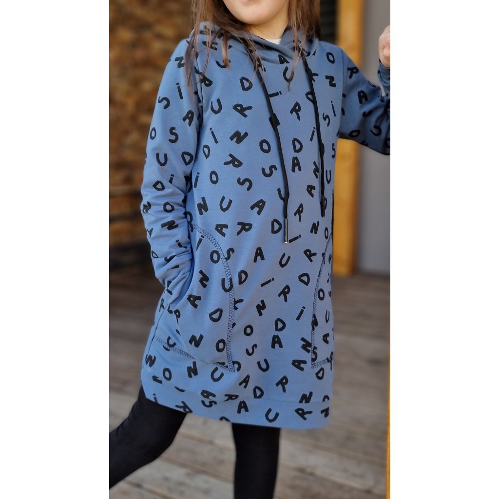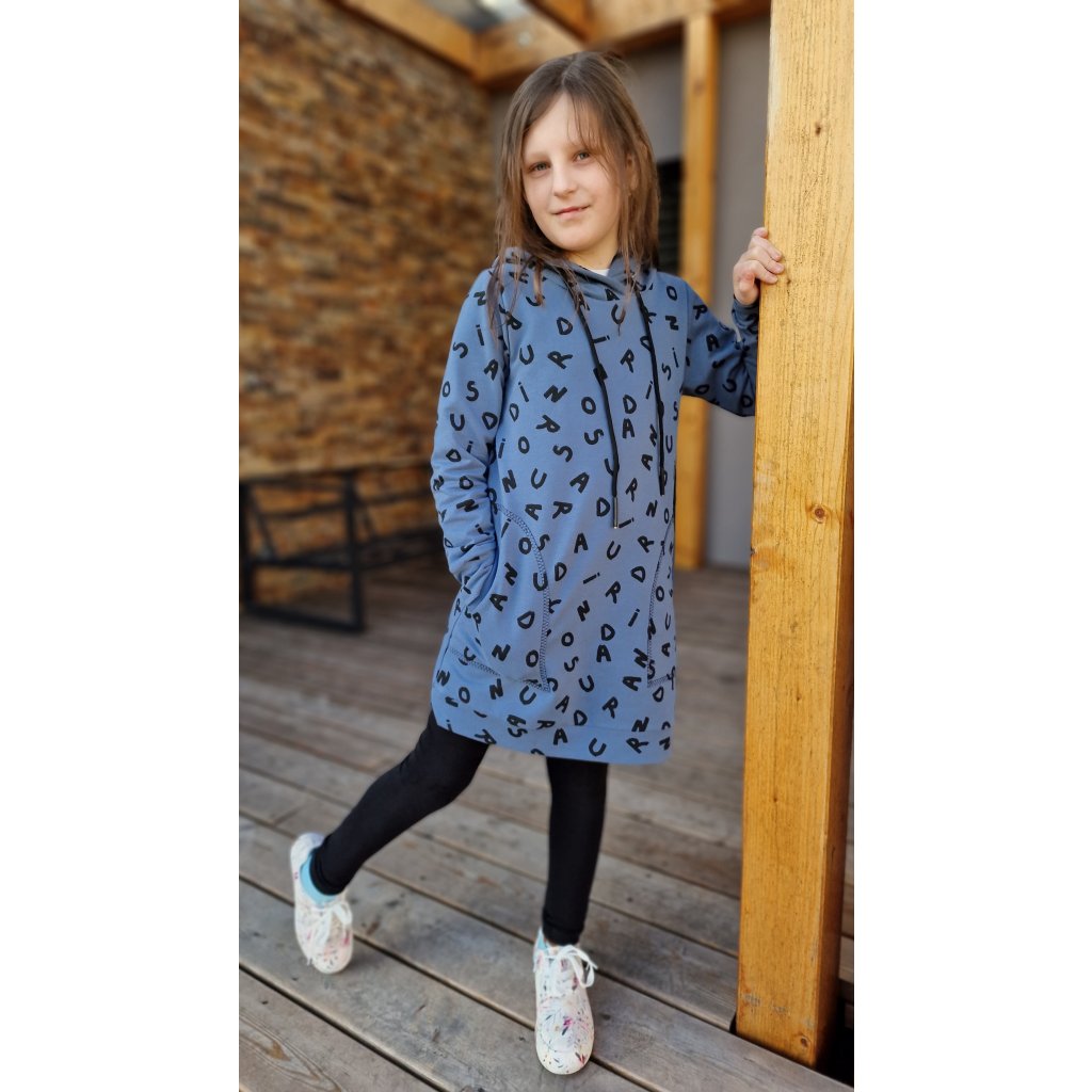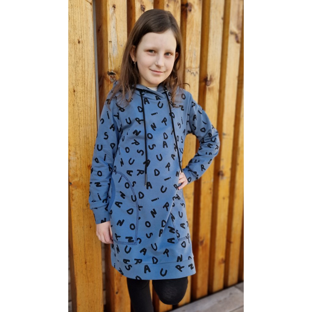 Tištěný střih na dívčí mikinošaty volnější siluety s kapucí a se třemi variantami kapsy.